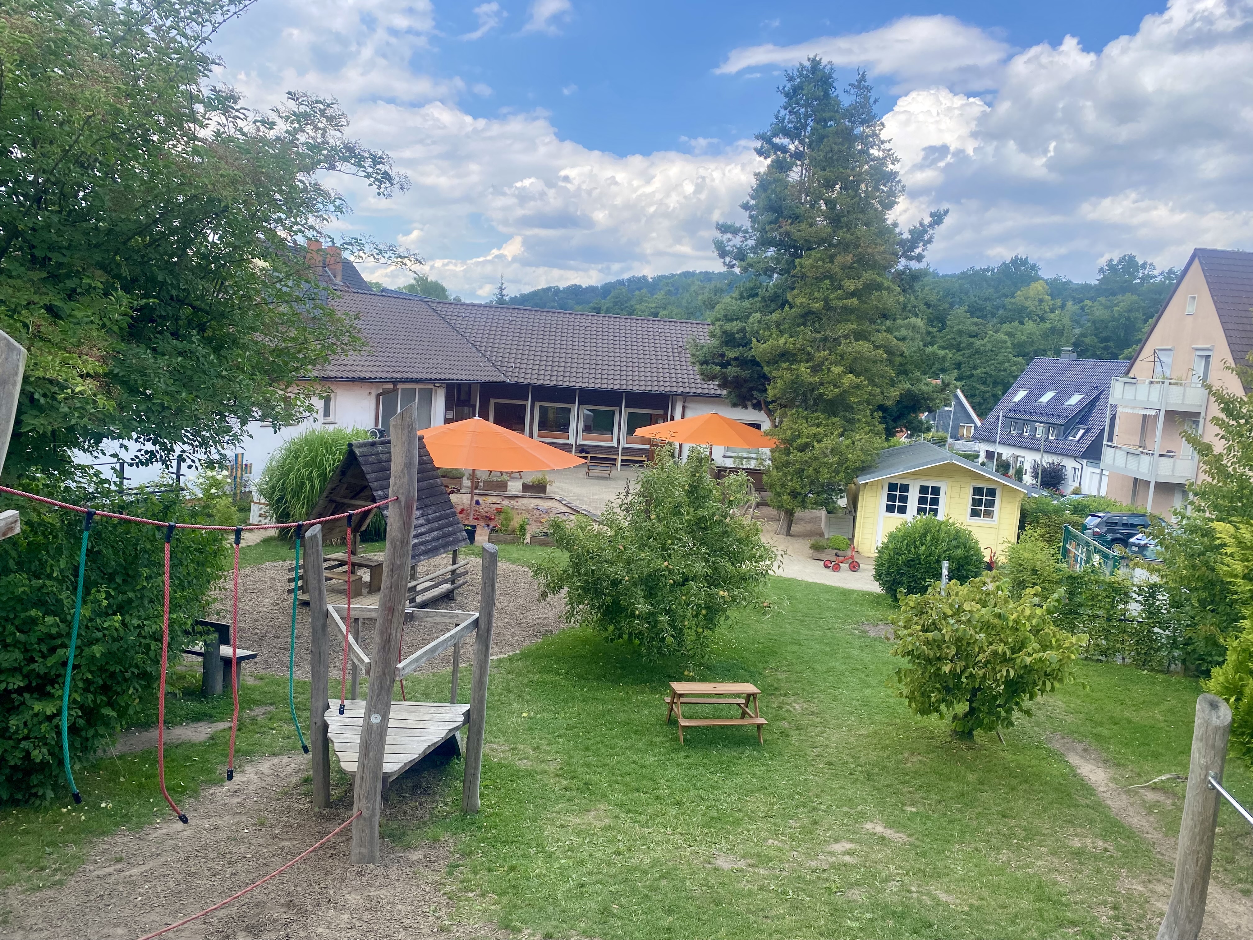 Inmitten eines ruhigen Wohngebiets, umgeben von einem großzügigen Außengelände, in unmittelbarer Nähe eines Waldes, bieten wir Raum für Entfaltung, Bewegung, individuelle Entwicklung und Entdeckung.